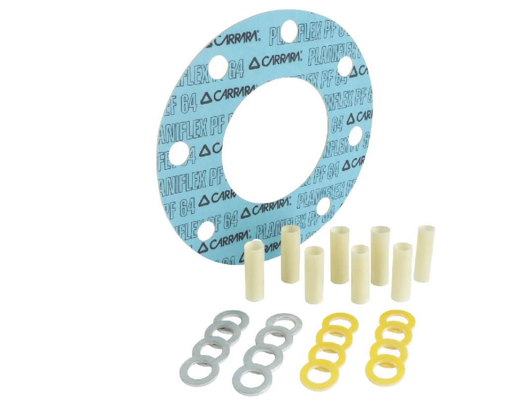 El kit Guardian Basic IPT puede utilizarse hasta 200°C, con clasificaciones ANSI 150–300# y PN 6–40#. Se recomienda siempre el uso de GRE G10 (FR4) – material compuesto de resina epoxi reforzada con fibra de vidrio – para los casquillos y las arandelas. En comparación con otras soluciones, especialmente las fenólicas, el GRE G10 tiene un factor higroscópico mucho menor: esto garantiza la máxima eficiencia de sellado durante toda la vida útil prevista, evitando fallos debidos a la pérdida de carga mecánica causada por la degradación de las arandelas.